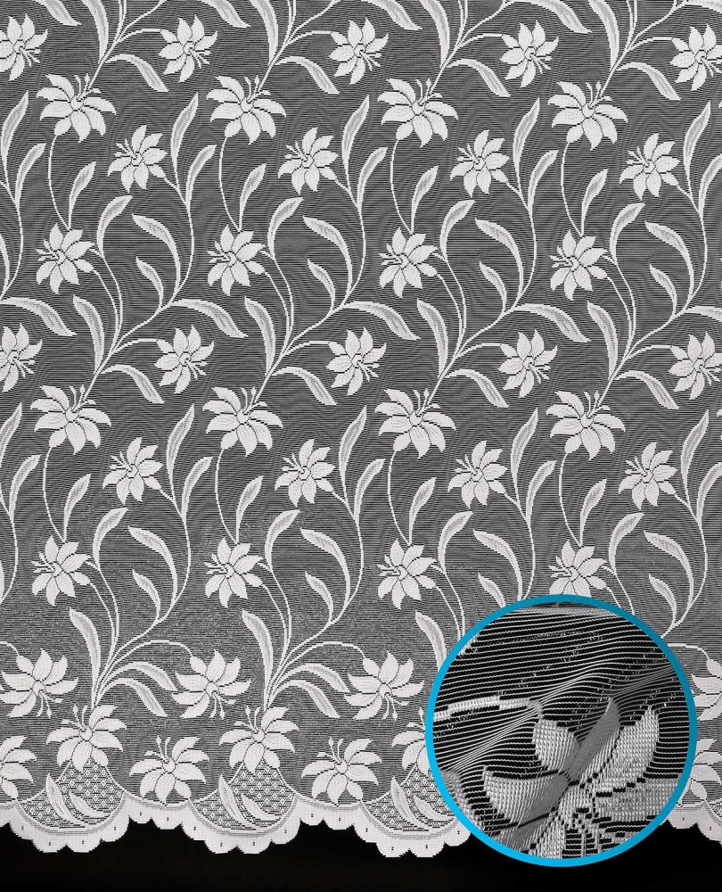 Klasyczna firana żakardowa z delikatnym połyskiem w kolorze białym. Wzór tworzą drobne kwiaty oplecione gałązkami.